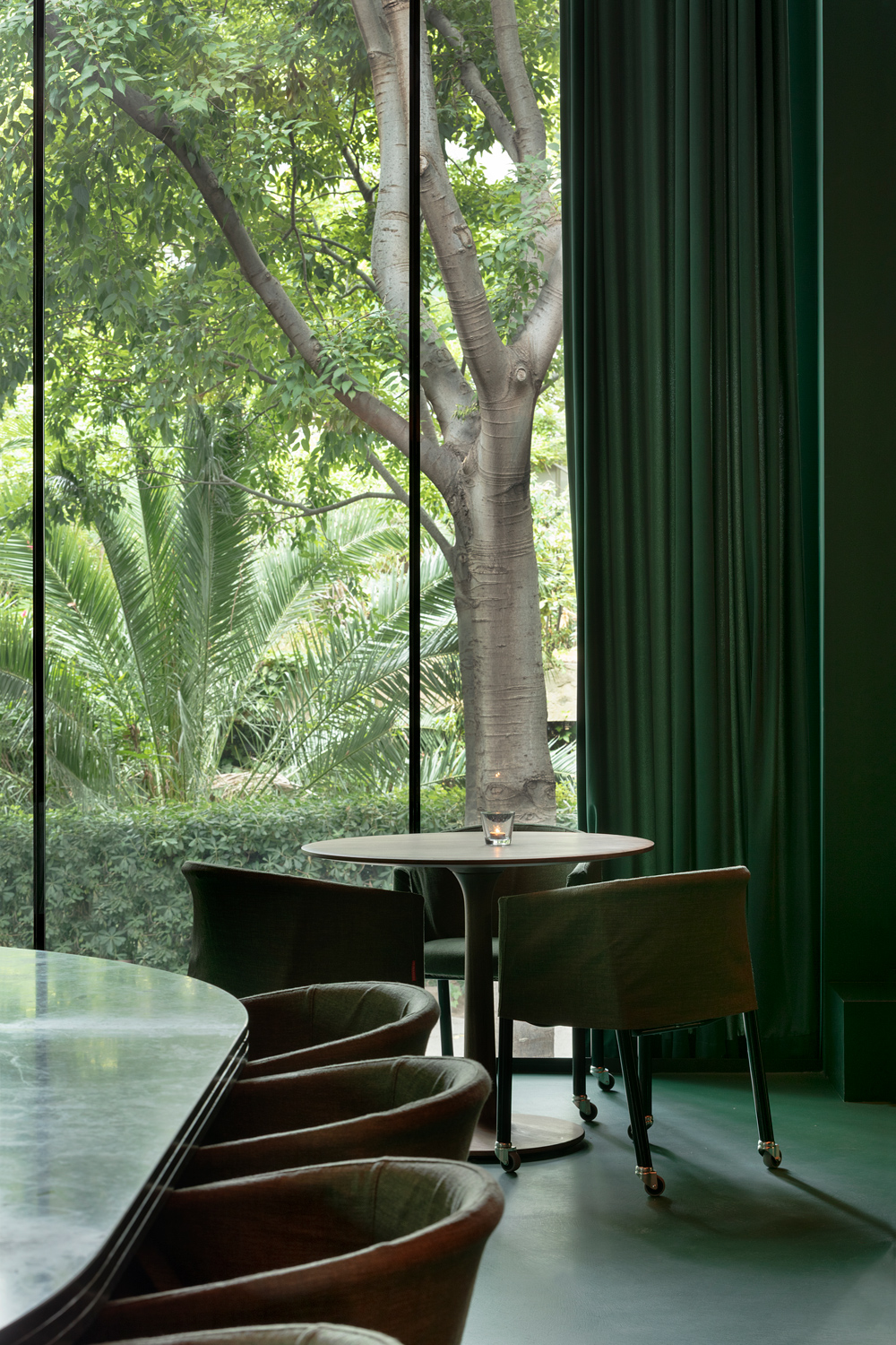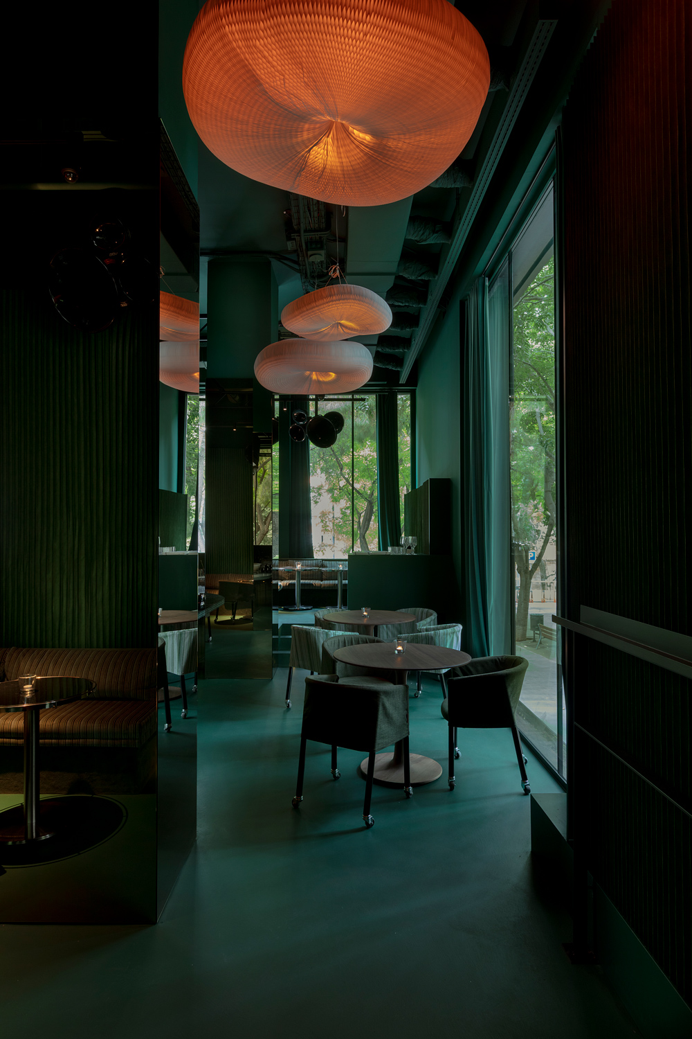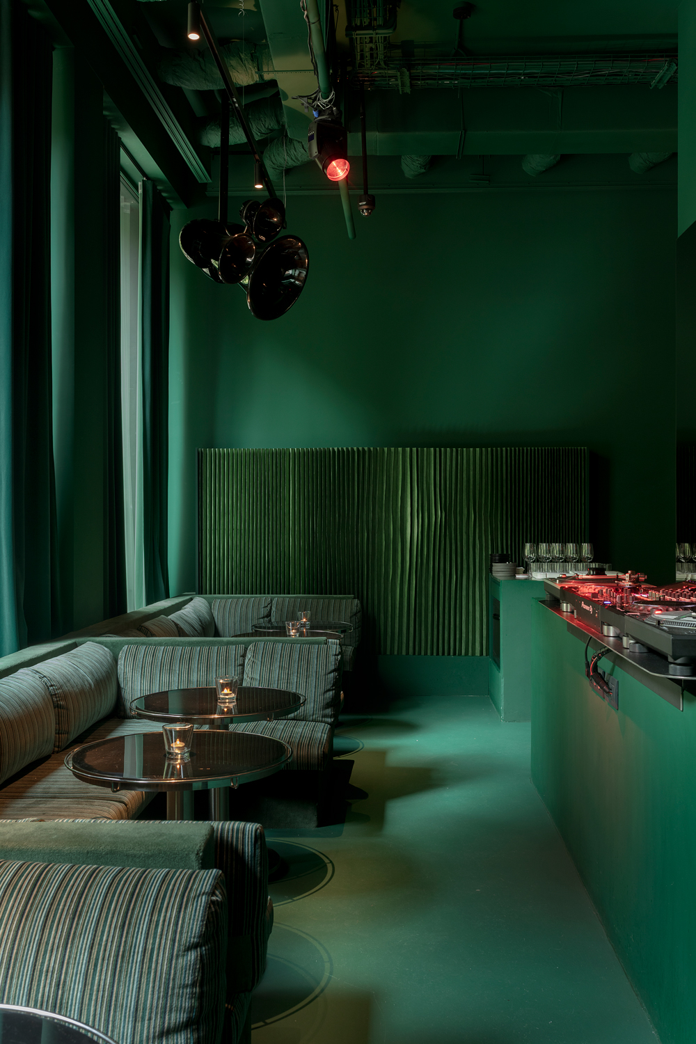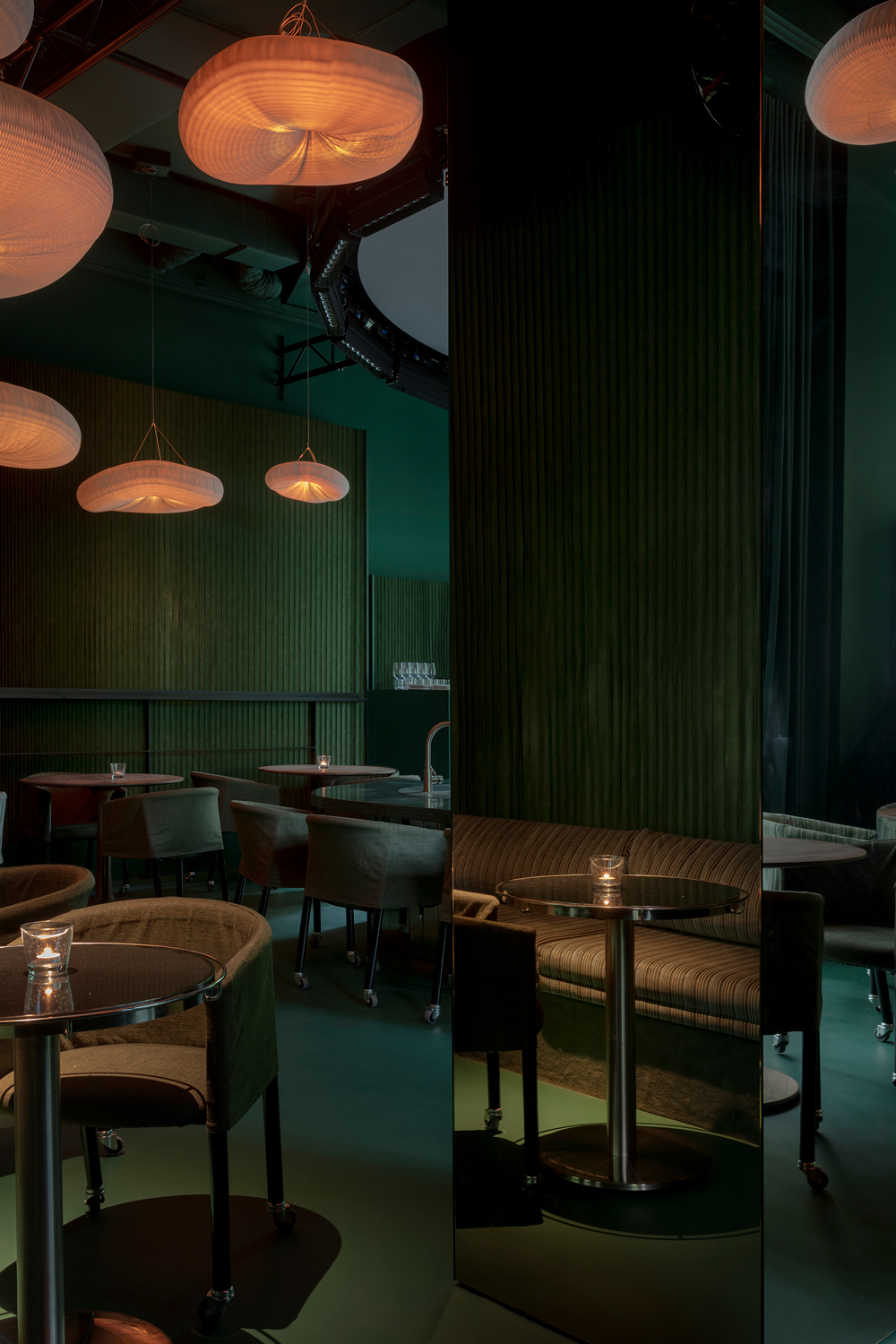 Das von Pilar Líbano gestaltete Interieur schafft eine stimmige visuelle Identität im gesamten Gebäude: grüner Marmor, gestreifte Wandverkleidungen und eine Farbpalette aus hellen Grüntönen, kräftigen Rottönen, tiefen Blautönen und reinem Schwarz. Das Cohete bietet eine einzigartige Balance zwischen Retro-Ästhetik, Popkultur und ungezwungener Atmosphäre. Der Raum weckt starke Assoziationen mit Reisen und Weltraumbildern, wie der Name bereits andeutet (Cohete bedeutet auf Spanisch “Rakete”), ohne dabei jedoch in einen kalten oder sterilen futuristischen Stil abzudriften. Im Gegenteil, der Veranstaltungsort bietet eine warme und nostalgische Atmosphäre mit Anklängen an die 1960er, 1970er und 1980er Jahre, als der Raum ein Symbol für Träume, Entdeckungen und Möglichkeiten war.