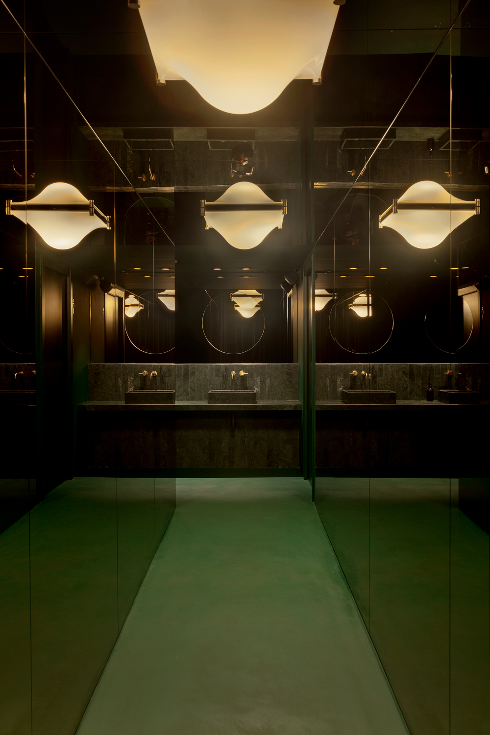 Die Wahl von Solidro, dem neuen fugenlosen, wasserfesten Mikrofinish von Ideal Work, trägt ebenfalls zur Kontinuität der Räume und zur Stärkung ihrer visuellen Kohärenz bei. Es wurde in einem speziell angefertigten Farbton NCS S 7020-G aufgetragen, der die im gesamten Veranstaltungsort präsenten dunklen Grüntöne aufgreift. Solidro ist frei von Epoxidharzen und anderen potenziell flüchtigen chemischen Verbindungen, trägt zur Erhaltung eines gesunden Raumklimas bei und ist absolut wasserdicht: Es nimmt weder Wasser noch andere Flüssigkeiten auf, ist äußerst fleckenbeständig und extrem pflegeleicht.